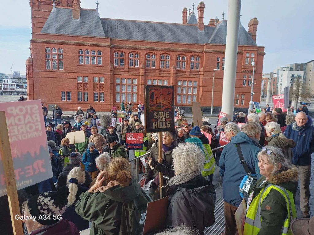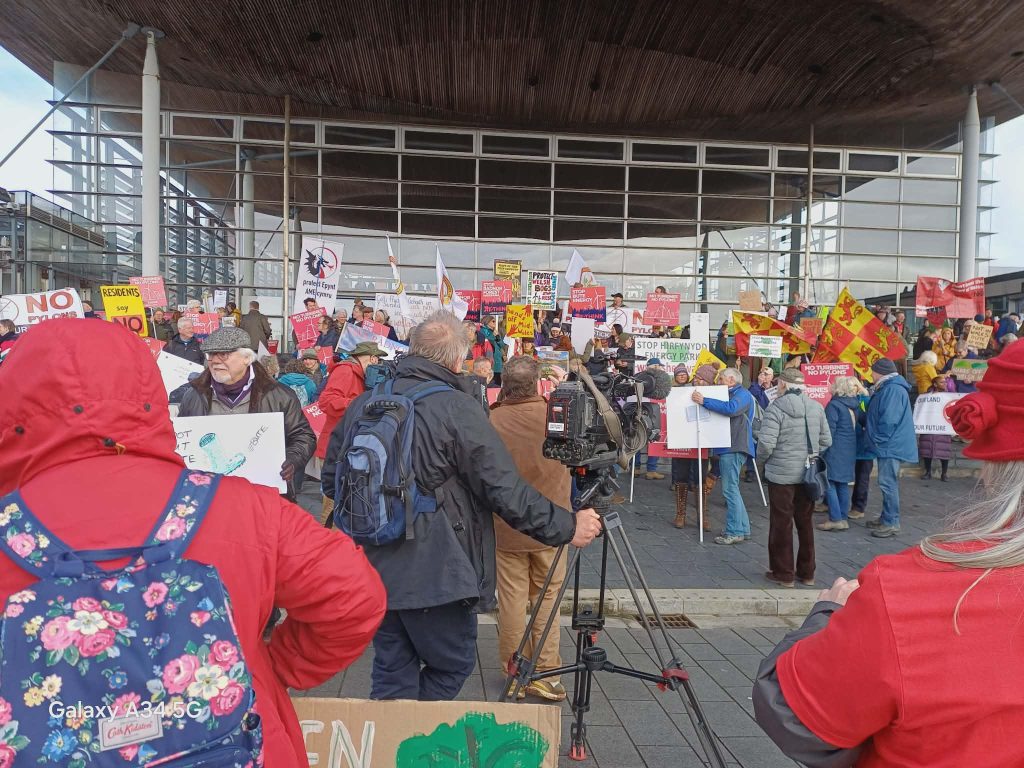 On Wednesday 11th February, groups from all over Wales and, in fact, some from Scotland and England, joined together in front of the Senedd in Cardiff to express their views about what the proposed windfarm and pylon schemes would mean to Wales as a country and to them as individuals. There was music, speeches, chanting and enormous sense of unity in the desire to stop Wales, yet again, being plundered for profit.
